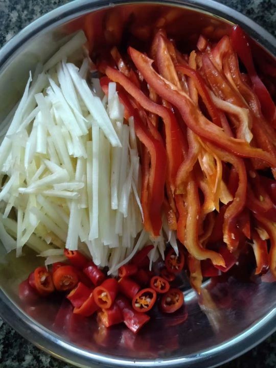 1.仔姜切丝,红辣椒切丝,小米椒切圈
