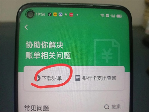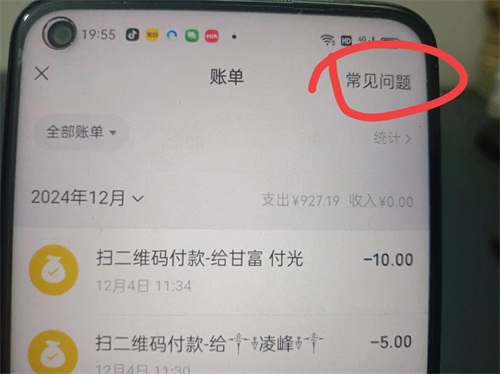我们还是回到微信的账单页面。点击右上角的常见问题,(如上图所示)