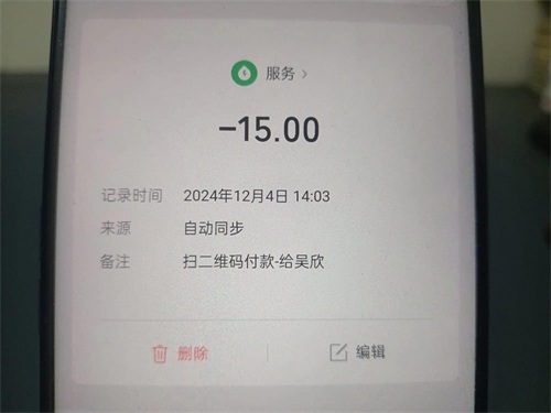 这时候可以看到我在2024年12月4日14:03分,通过扫二维码付款了一笔15的账单,现在我将其删除掉。(如上图所示)