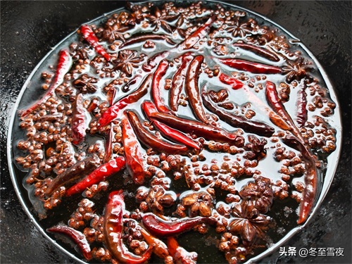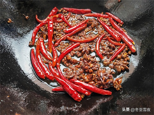 6.锅内加入2两油烧热,下入10克花椒和10克八角,小火炸香,再下入15克干辣椒炸香。