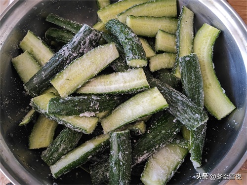 3.把切好的黄瓜放到盆内,加入5两盐,翻拌均匀,使黄瓜都均匀的裹上盐。