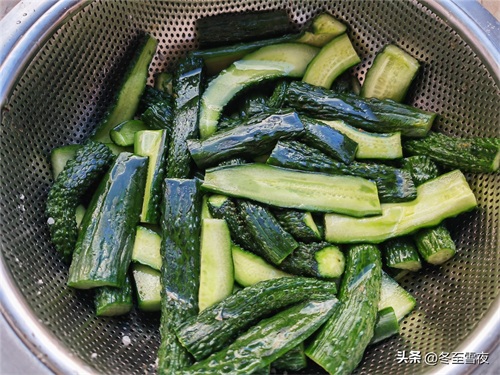 5.到时间后,把黄瓜捞出,沥净水分,放在盆内待用。腌好的黄瓜不要用水洗,水洗后,腌好的黄瓜不易保存。