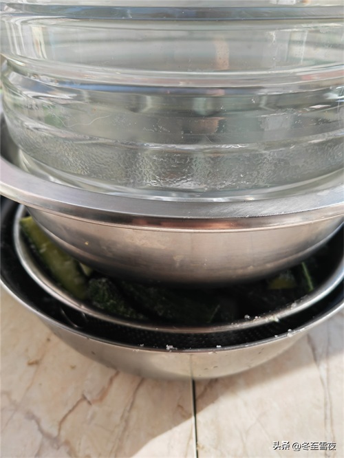 4.找一个同样大的盆,压在黄瓜上,盆里放上重一些的石头,压在上面,没有石头,用小一些的桶装水压也可以,压上2-3小时,把黄瓜一部分的水分压出来。