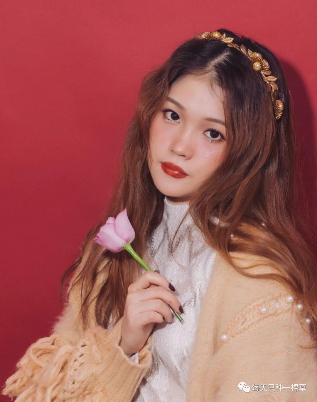 但对亚洲人的黄皮不友好,所以我改良了一下,选择了同样很圣诞的红金色系。