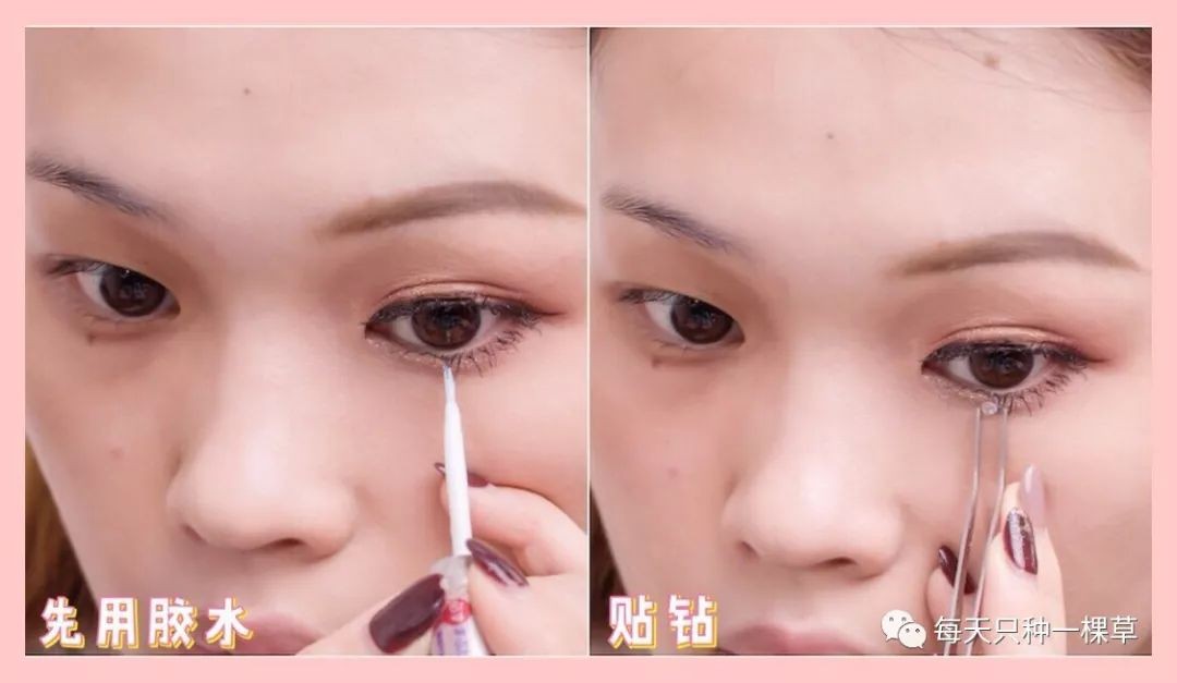 用胶水轻轻点在卧蚕位置中间,贴上水钻,瞬间点亮眼妆,黑暗中也是一颗忽闪忽闪小星星。