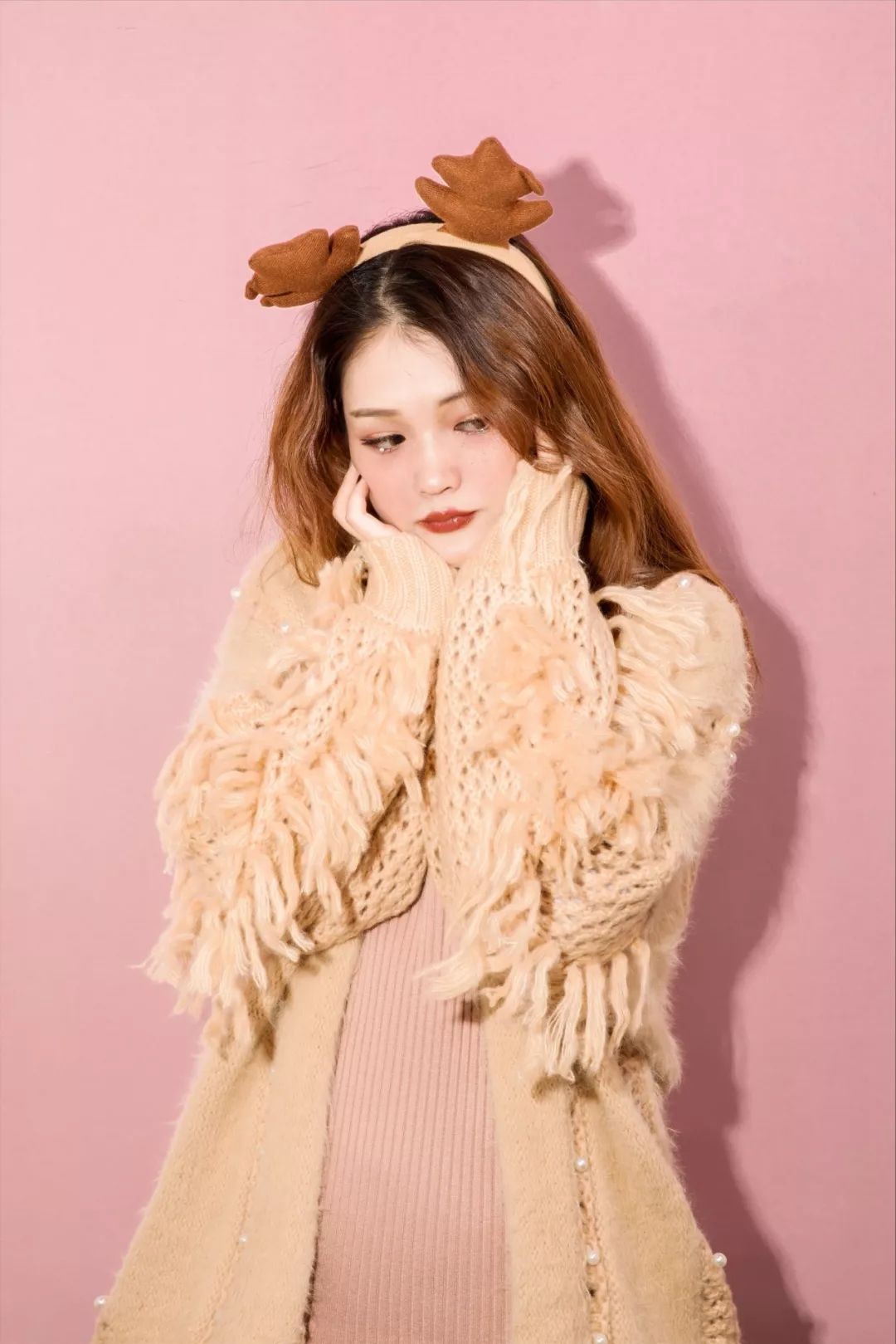所以我把浓重的紫红色调改成了比较少女又温暖的干枯玫瑰粉,再搭配银白色和金色亮片,像阳光下裹着皑皑白雪的小麋鹿。