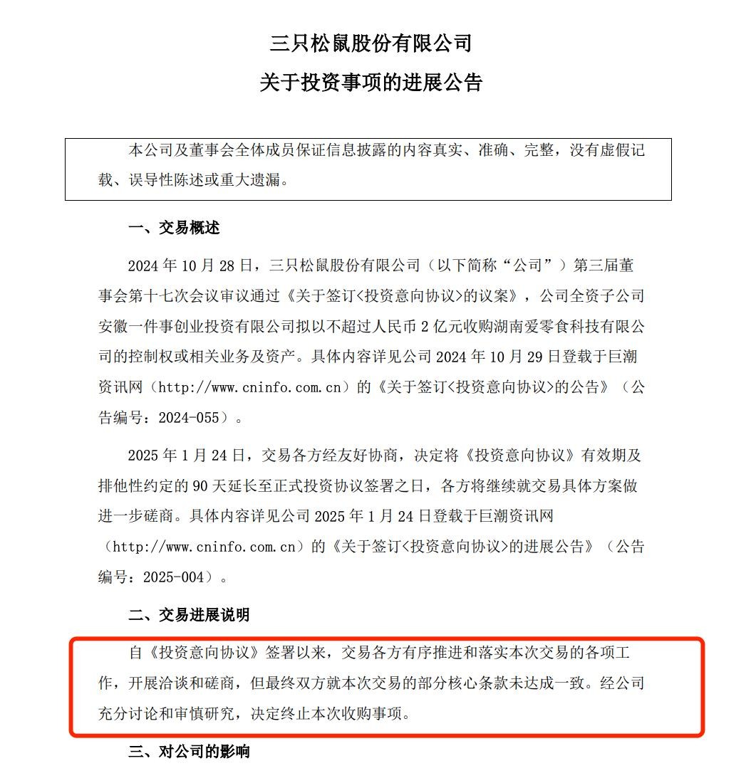 6月16日,三只松鼠公告称,去年10月,其全资子公司拟以不超过2亿元收购爱零食的控制权,但最终双方就本次交易的部分核心条款未达成一致,决定终止本次收购事项。