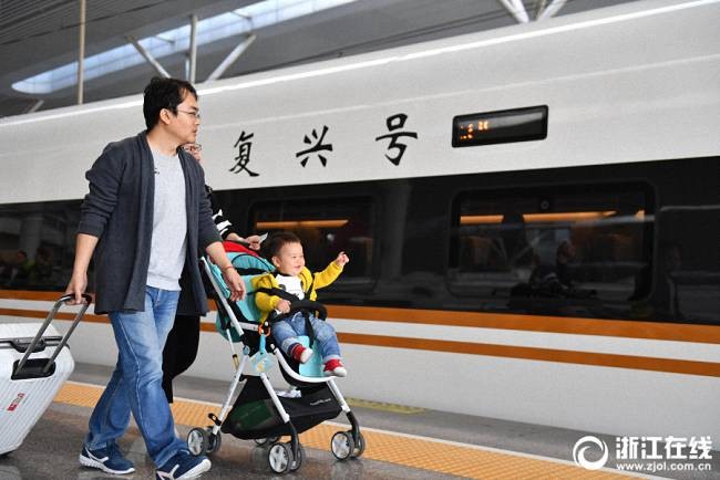浙江在线4月10日讯(记者 阮西内 倪雁强 拍友 高淑滢摄)4月10日零时起,铁路实施新的列车运行图,杭州东站至北京南站增开3对时速350公里的“复兴号”动车组列车。从杭州乘高铁出发,最快4小时23分即可到达北京。