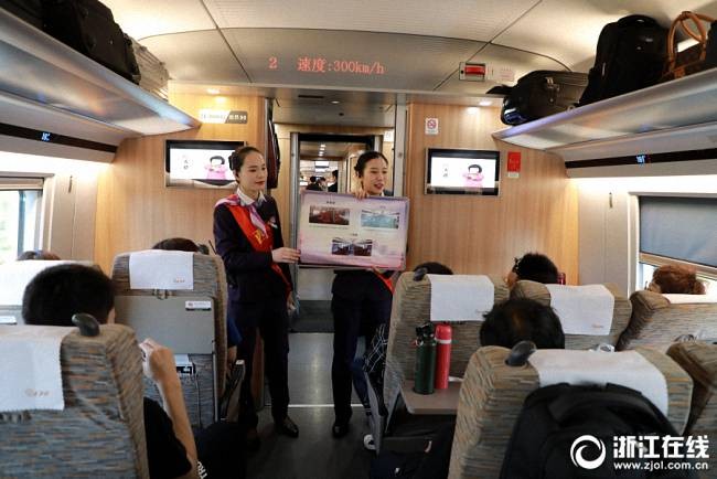 G20次列车乘务员向乘客们介绍复兴号动车组的优点。