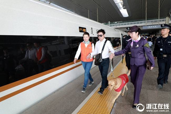 G20次列车乘务员引导盲人上车。