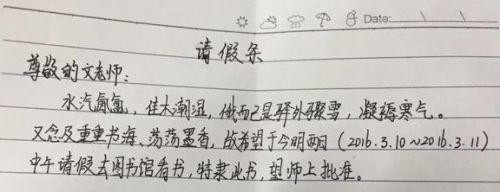 从这张请假条上可以看出,这位学生喜欢看书,加上近两日长沙气温骤然转凉,午休可能不太适应,因此想向老师“请假”去图书馆呆着。时刻新闻记者联系到了该名学生的班主任丁老师,“他是一名文史功底很强的孩子,创作激情很足、对文学有非同一般的感情。”丁老师解释说学校有寄宿生和走读生两种,管理模式不一样,寄宿生午休时间应在宿舍,外出则要向老师报备。“孩子们不是流水线上的产品,我们应该在现有的环境下支持他们热爱的东西,”丁老师说:“我当然批准了他的请假条啦!”