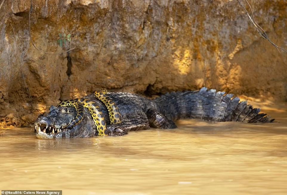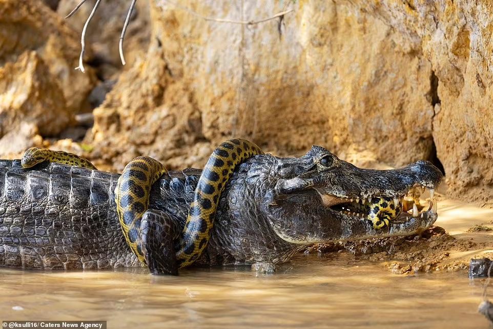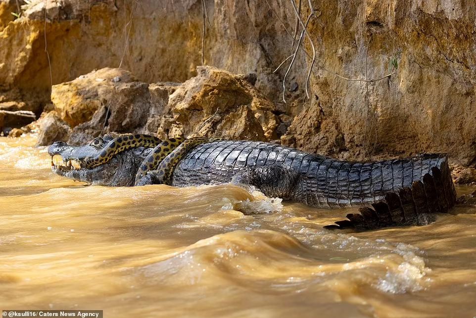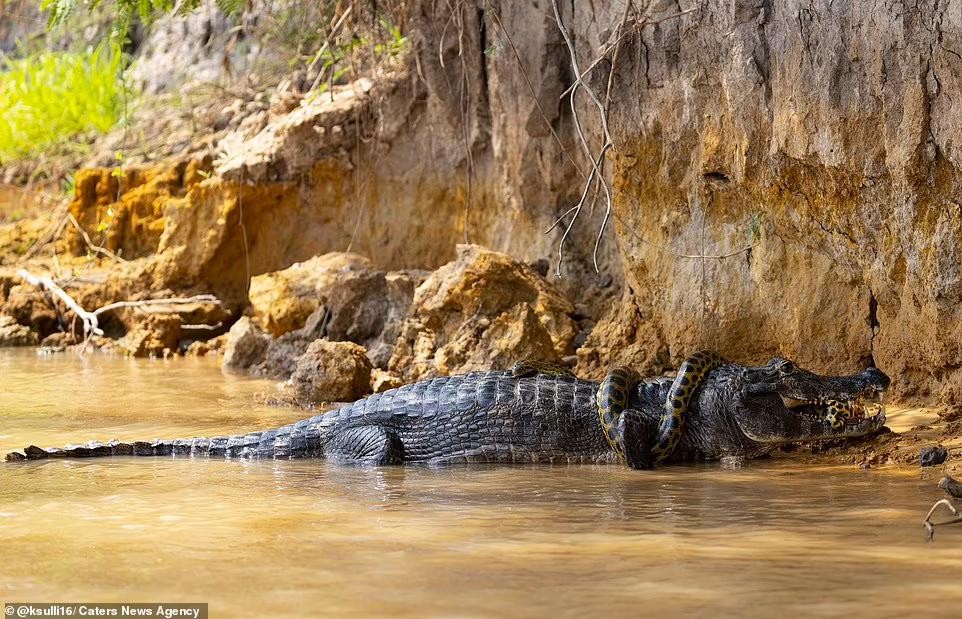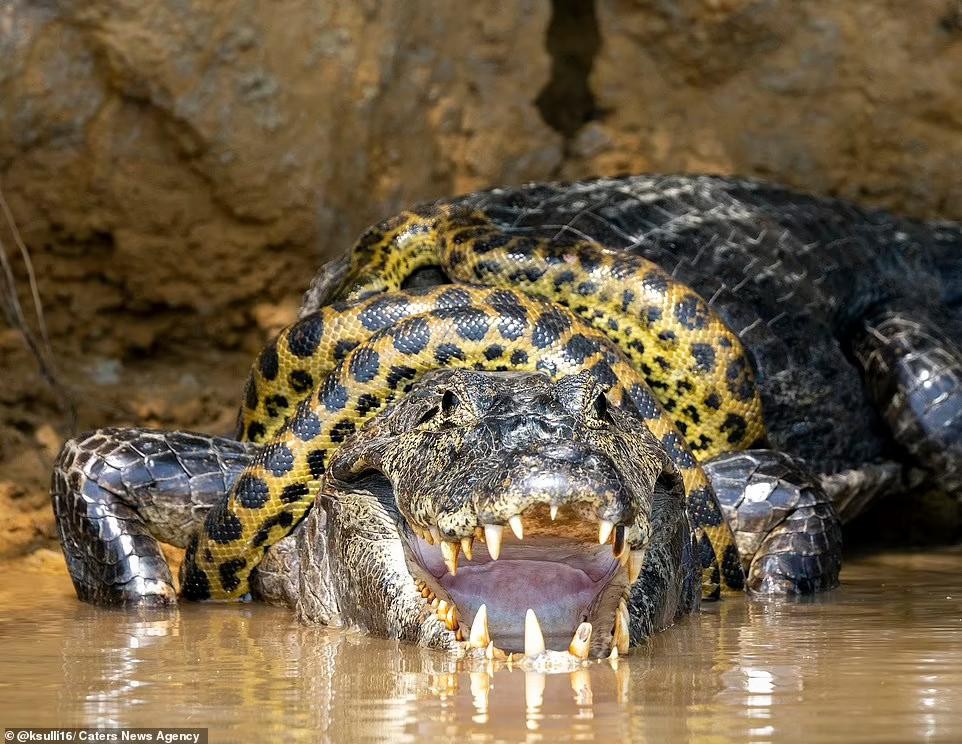 巴西巨蟒河中大战凯门鳄,摄影师拍下40分钟罕见夺命缠斗