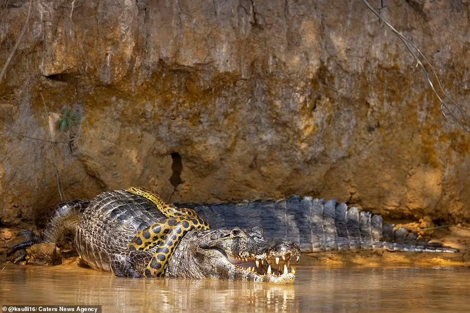 美国野生动物摄影师金·沙利文近日在巴西意外拍到极为罕见的巨蟒大战凯门鳄场面,巨蟒在库亚巴河中将凯门鳄紧紧缠住,凯门鳄拼死挣扎,这场夺命之战进行了40分钟,最终打了一个平手。