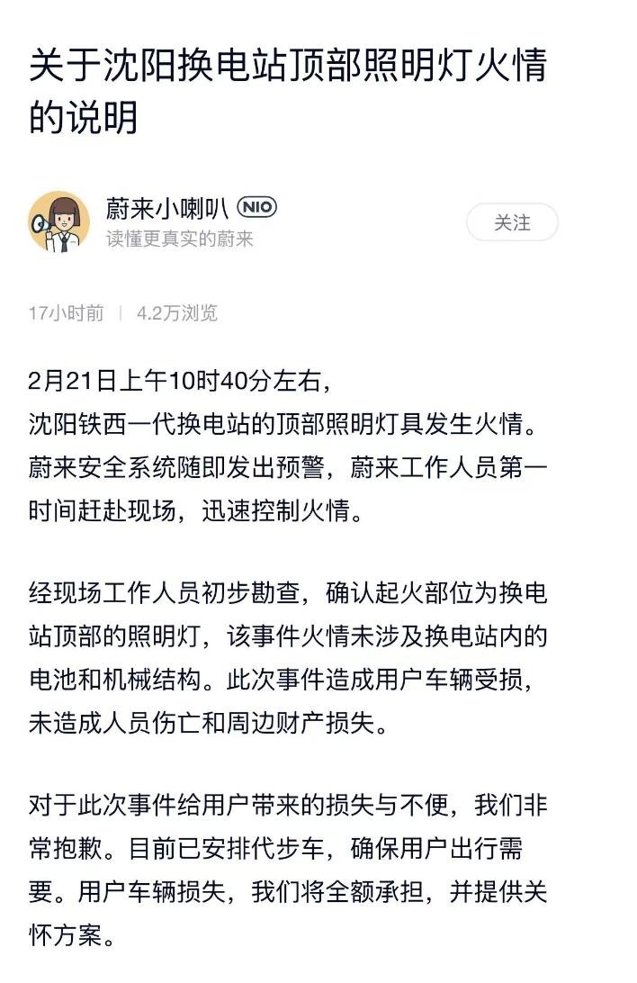 关注|蔚来官方回应换电站起火事故:屋顶照明灯起火