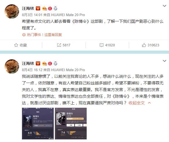 8月2日、3日和4日汪海林都不断在微博中与网友互怼,并毫不掩饰地表达了自己对《陈情令》一剧的厌恶之情,并直接用“恶心”、“烂剧”等词来形容。