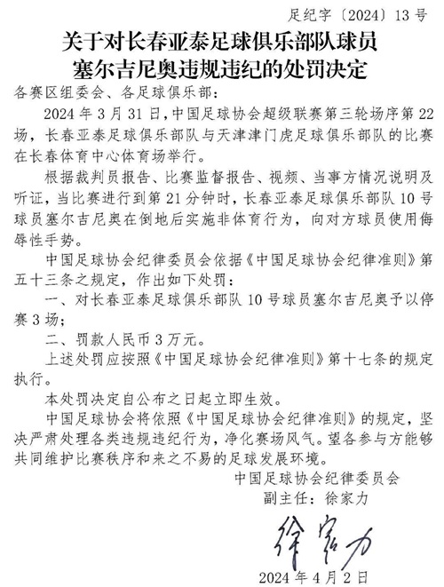 北京时间4月3日,中国足协针对上周联赛的一些违纪行为开出罚单。