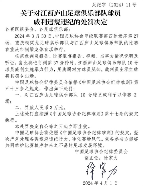 在中甲第4轮重庆铜梁龙对阵江西庐山的比赛中,第37分钟,江西庐山10号球员威利实施暴力行为,用脚踢对方球员腿部,当值裁判将其红牌罚下。针对这一行为,中国足协对其停赛三场,罚款3万。