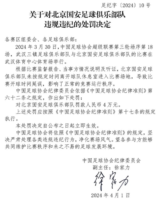 北京国安在中超第3轮客战武汉三镇的比赛中未按照规定时间离开球队休息室进入比赛场地,被罚款4万元。据悉,国安晚了2分钟入场。