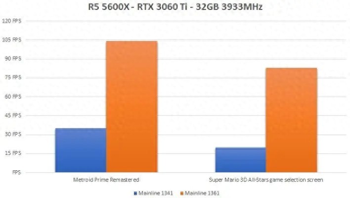 以模拟《银河战士 Prime:重制版》(Metroid Prime Remastered)和《超级马里奥 3D 全明星》(Super Mario 3D All-Stars)为例,1361 版本的游戏帧率是 1341 版本的 3 倍。