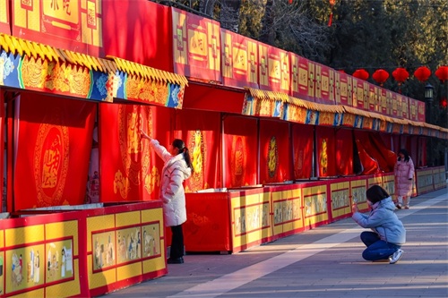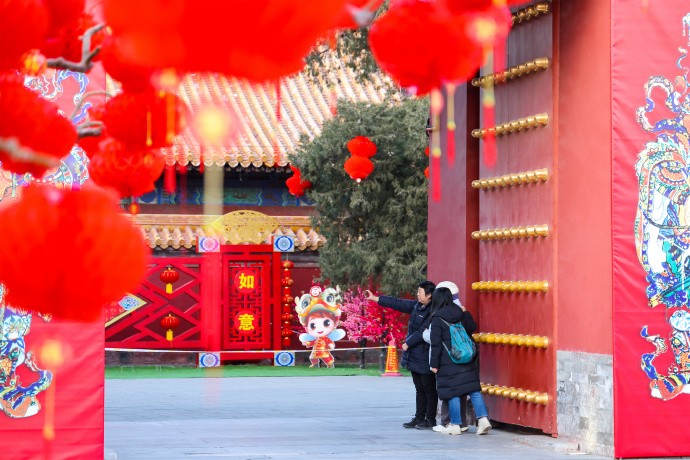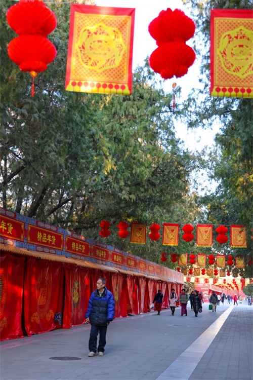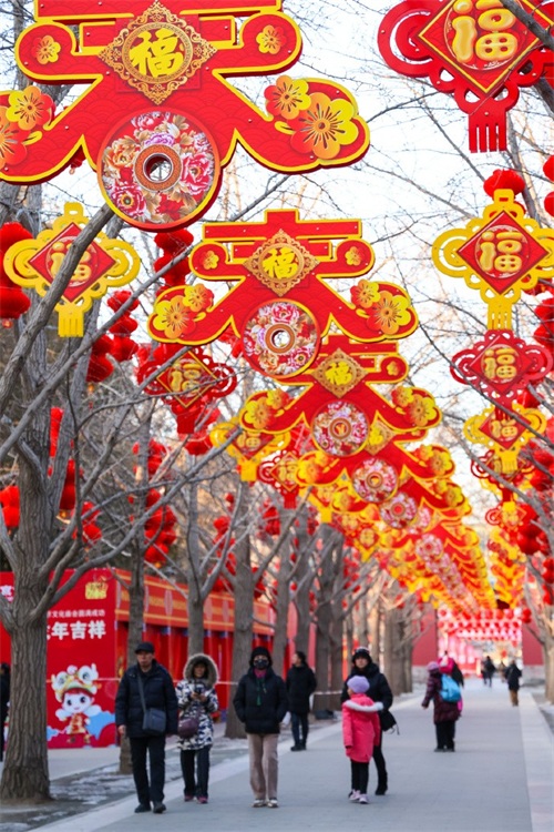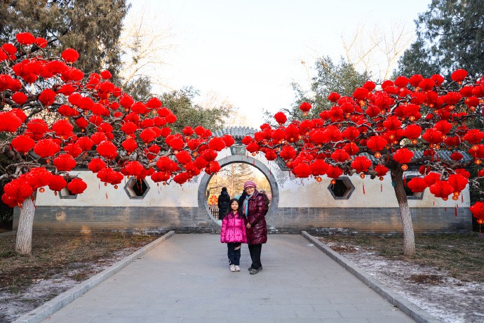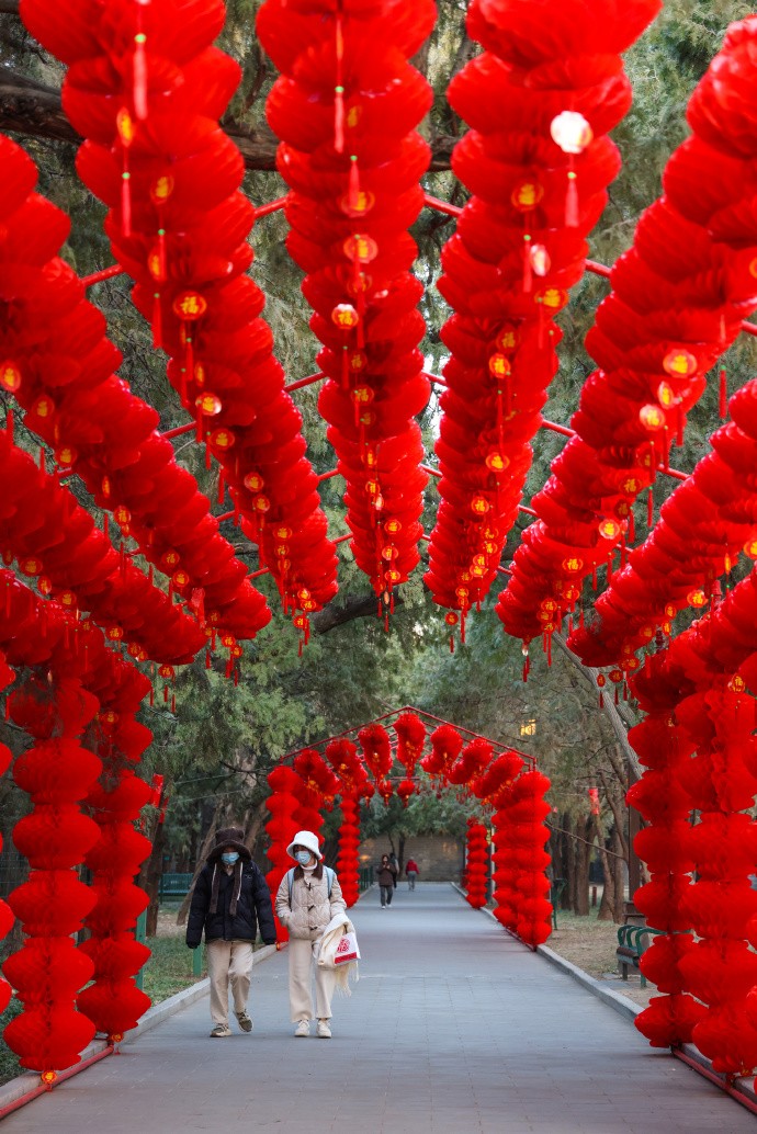 2月7日,北京地坛公园内挂满了大红灯笼,与“春”字、象征吉祥如意的中国结相映衬,烘托了浓浓的年味,吸引了不少市民、游客前来感受喜庆氛围 。