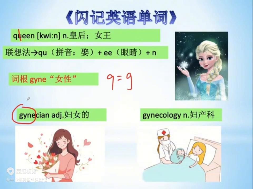 2. 之前给大家讲过 e 字母代表眼睛的含义,娶一个眼睛大大的女王。哭音有一个同源词根叫 qi,表示女性的意思。这里大家注意一下,q 转换成了 g。由这个词根在女性派生的两个单词:janeshen 表示妇女的。janesen 妇女的的前四个字母 jane 就表示女性的词根。后面的 china college 妇产科同样里面的 g、i、n、e 表示女性的含义。
