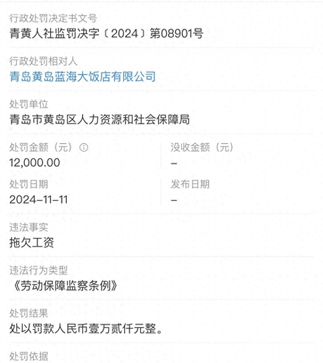黄岛蓝海大饭店因拖欠工资被罚款 山东蓝海近日宣布破产重整