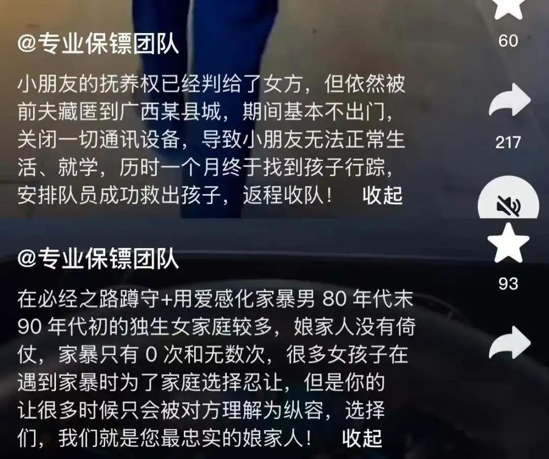 大哥们转型女性守护:专业保镖团队红了抖音,几天涨粉10万 近日,一个叫“专业保镖团队”的大哥们转型组织火速走红抖音,他们不再是互联网黑道大哥们,而是女性的守护天使。这个团队只有几天时间就涨粉10万,是什么原因让她们如此受欢迎呢?原来团队退役军人组成,为了维护女性权益而成立。专门处理家暴、霸凌等问题,70%的客户是女性。大哥们做的行业看似凶狠,实则给与女性温暖的保护。 这不,阿磊也是退役军人出身,他和几个兄弟组建了专业保镖团队,几天就火了。阿磊表示,我们专业保镖团队主要是保护女性安全的,在抖音几天就涨粉10万。女性求助的人数特别多。阿磊说,我们不是打手,我们是保镖,我们的服务内容包括:谈判、威慑、陪护、心理辅导等。阿磊说,具体案件具体分析,服务费用1-2万不等。根据客户的不同需求提供个性化解决方案。随着女性需求的不断增加,我们团队也在不断转型,从最开始的保护富人的安全,到现在保护普通人的权益。阿磊说,我们就是当代女性的安全保障。