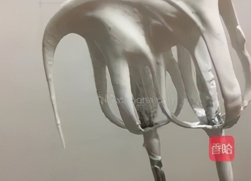 4.打发至这样硬性发泡,牙膏状,提起打蛋器有这样的弯钩,用手摸一下很顺滑就可以了