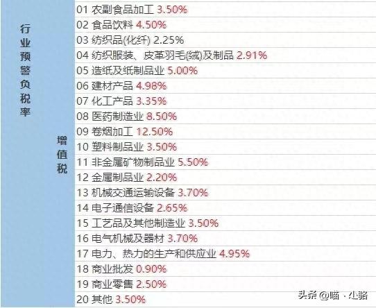 我在网上见过如下图这样的行业预警税负表,如果新手小白看到这个行业预警税负表后心里估计会想,现在我任职的公司税负率与这个相差太大了,下个月想着一下子就把公司的税负率提高或者降低至到这个比率。不提高/降低说不定还不会马上有麻烦,一下子提高/降低说不定下个月税局就要找你麻烦。企业税负变化过大,税务检查人员可能会认为企业存在账外经营、已实现纳税义务而未结转收入、取得进项税额不符合规定、购进货物用于免税、集体福利等不得抵扣项目未做进项转出或虚开发票等问题。增值税一般纳税人增值税税负变动率异常,指标预警值正常区间:-30%-30%。