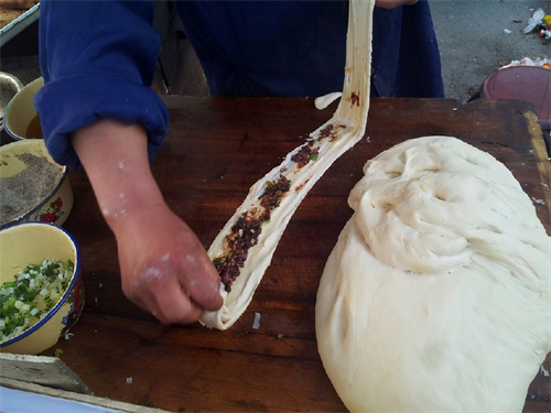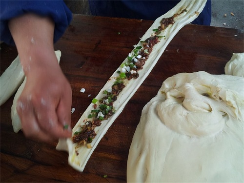 将面剂子抻长,上面抹上牛肉陷……。实际上正宗的延津火烧是素的。
