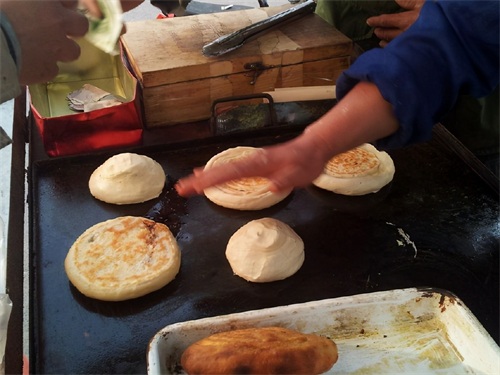摸好肉馅的面皮从一端卷上来,但最后不形成一个“懒龙”状,一端用手收拢,多余的面头揪下来,形成个馒头样拍在饼铛上。