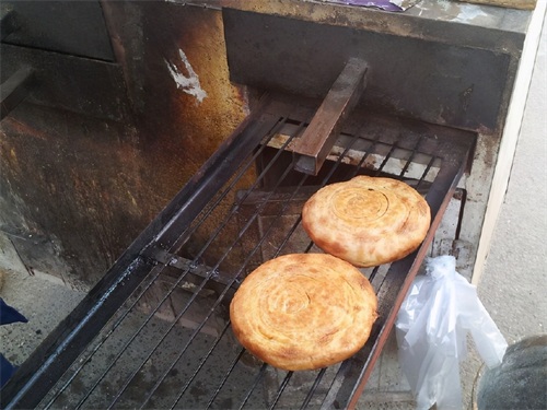 制作一个火烧前后大约半小时,新出炉的延津烧饼鼓蓬蓬的,样子像发面一样,实际上就是死面的,而且里面有陷。