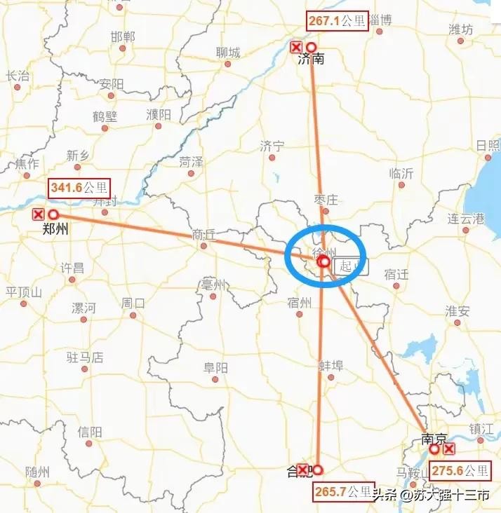 徐州到江苏省省会南京、安徽省省会合肥、山东省省会济南的距离基本相同,到河南省省会郑州的距离也差不多。