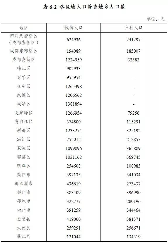 成都市下辖各区县市城镇和乡村人口统计