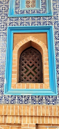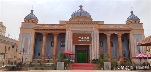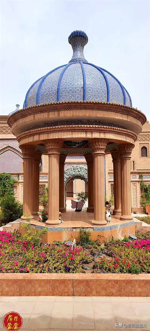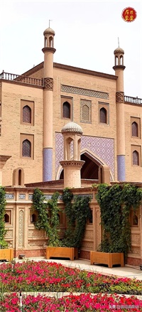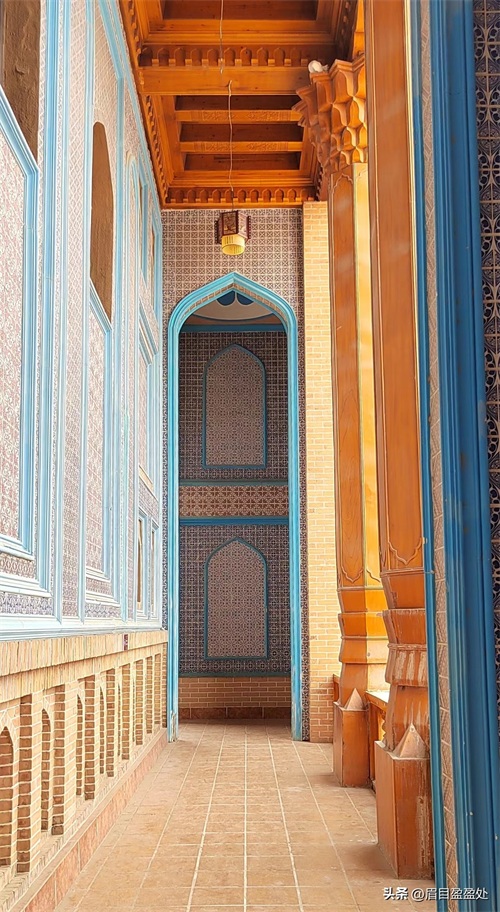 叶尔羌王宫被称作是“沙漠王宫”,只因它位于塔克拉玛干沙漠和达瓦昆戈壁中间,现在改建成莎车非遗博览园。整个园区的建筑具有浓郁的伊斯兰风格,蓝色的半圆拱顶,褐黄色的砖墙,蓝色或白色精致的雕花,无一不诉说着它昔日的辉煌。
