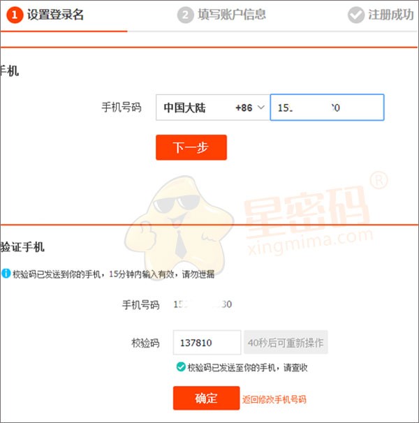 采用邮箱注册也需要手机号码验证,这一步操作者需完成这些操作:填手机号码——输入验证码——进入下一步。
