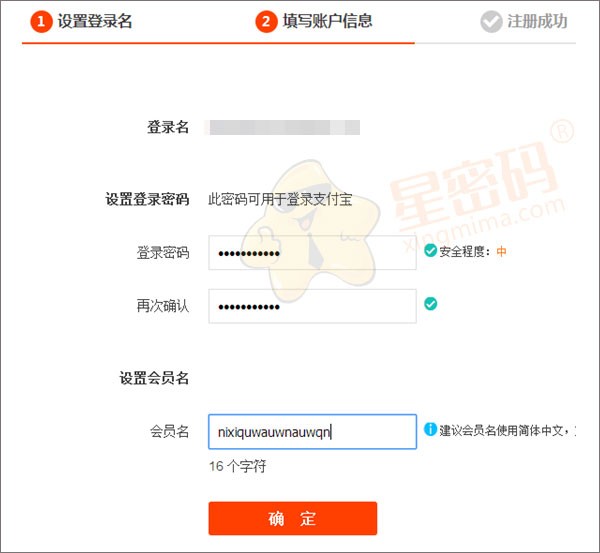 上一步点击链接或按钮后,操作者将来到填写账户信息页面,这里需要填写账户信息、登录密码、会员名等信息,填写完成后点击“确认”按钮即可。