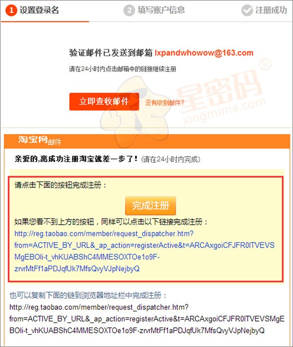 完成上一步的操作后,系统会发邮件到邮箱,操作者需打开该邮件并点击完成注册,若看不见按钮则可点击链接完成注册,如图: