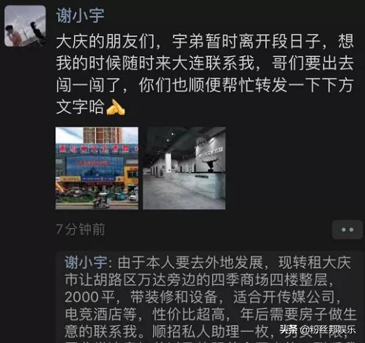 近日,谢小宇发布动态透露,他要暂时离开大庆出去闯一闯了,并且要将自己的整层2000平写字楼转租出去。