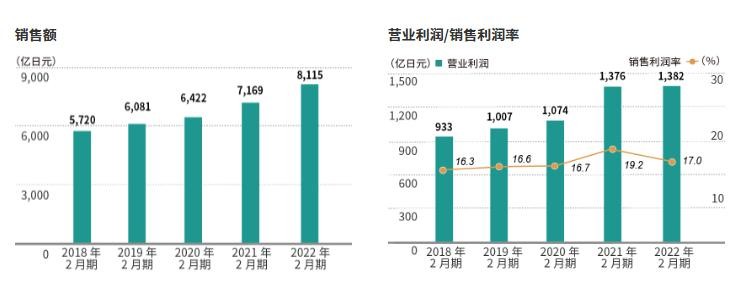 NITORI(宜得利)是由似鸟昭雄在上世纪六七十年代创立的日本家具品牌,据NITORIHoldings公布的截至2022年2月财政年度财务业绩,NITORI已实现连续35年销售额和利润双增长的神话。据2022财年年报,NITORI实现销售额 8,115.81亿日元,比上年增加了13.2%,净利润为 967.24 亿日元,销售利润率17%。