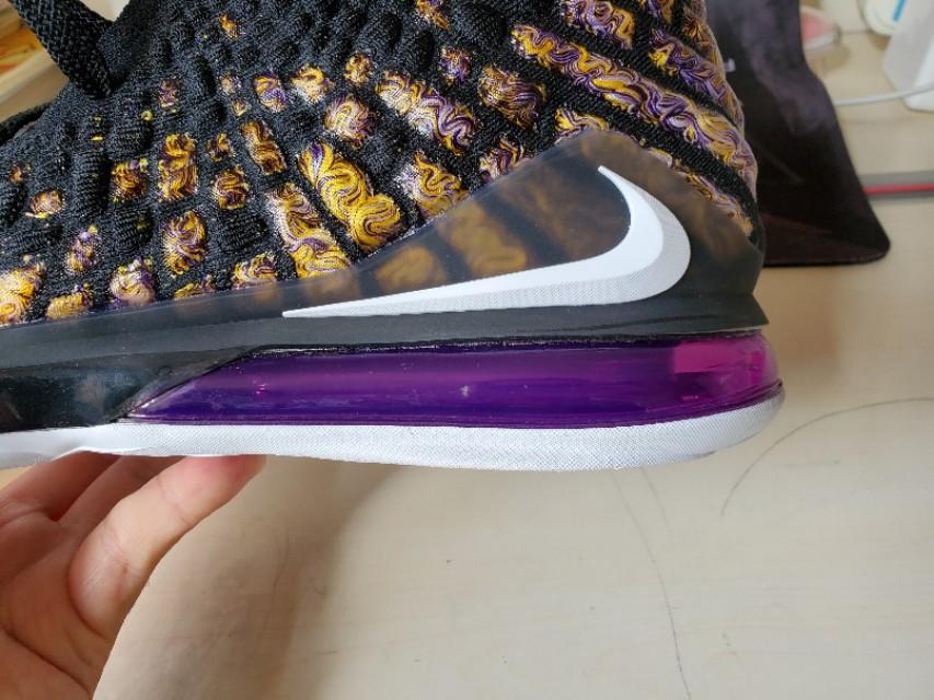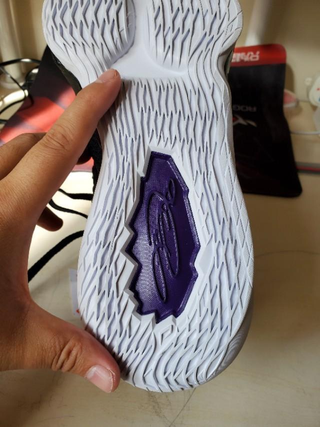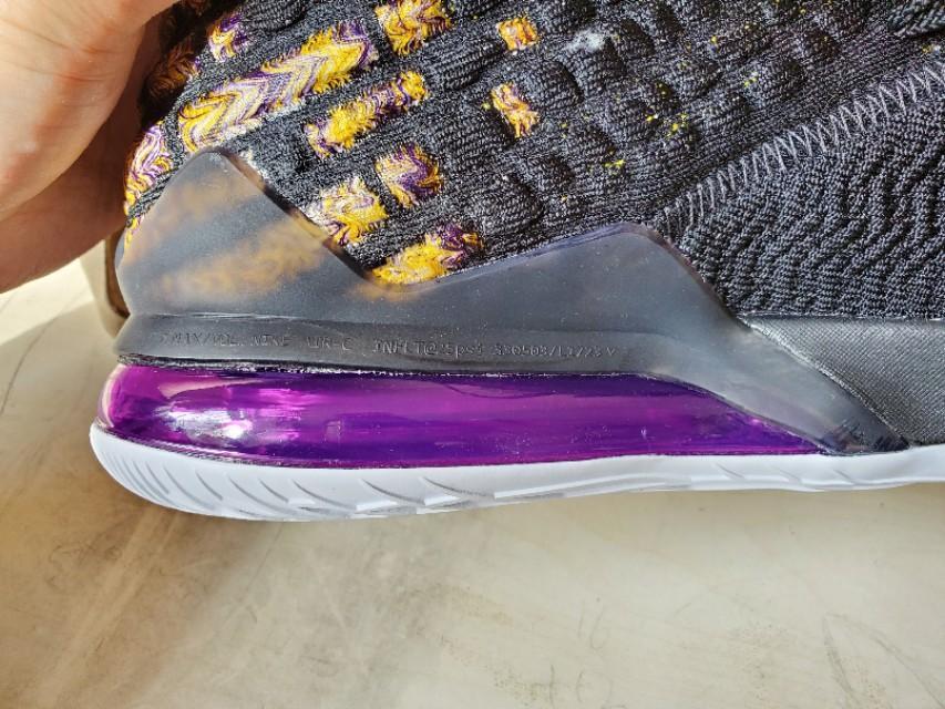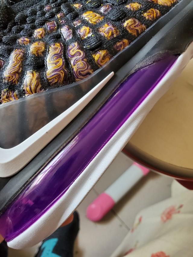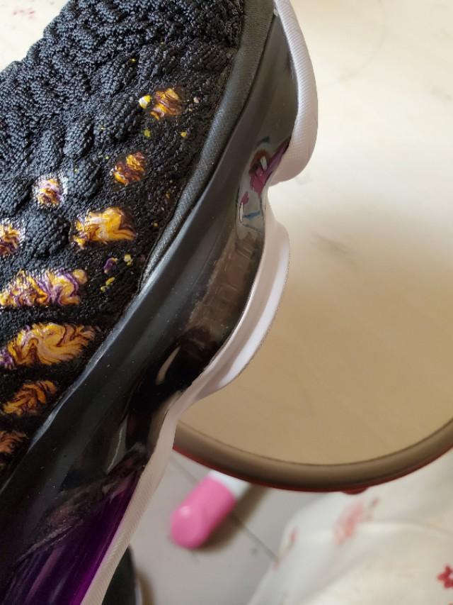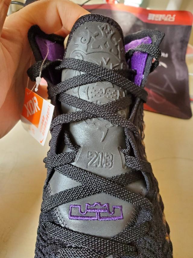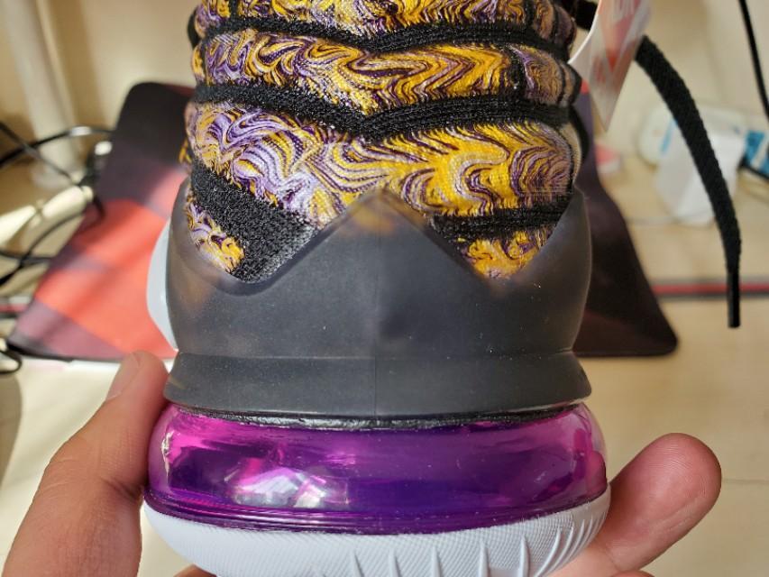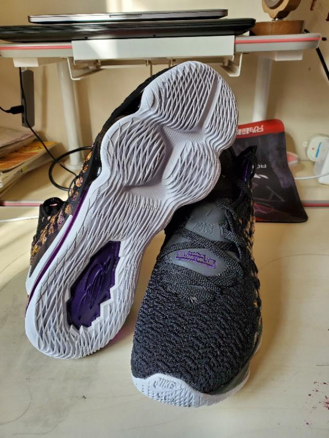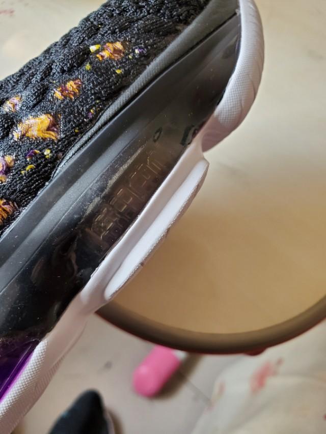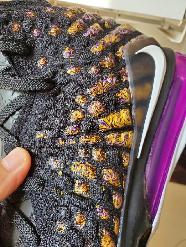 黑,紫,金构成的湖人配色还是一如既往的经典和美丽,不过个人感觉这一代老詹的鞋颜值真的不那么高,尤其是俯视角度,真的不好看,很像老头鞋。有点对不起这么好看的配色啊。