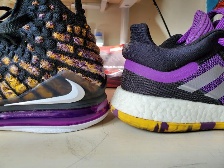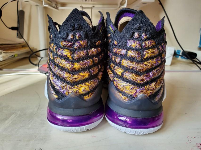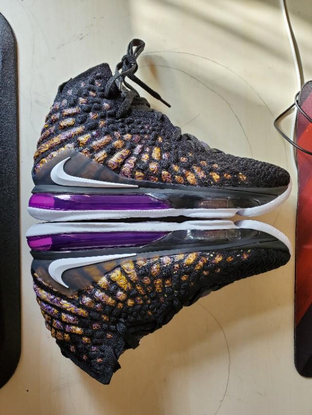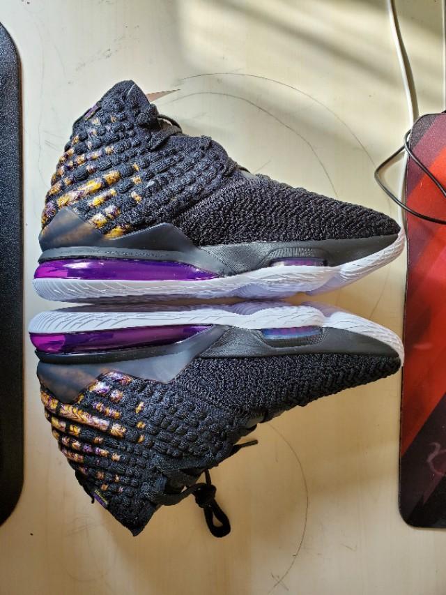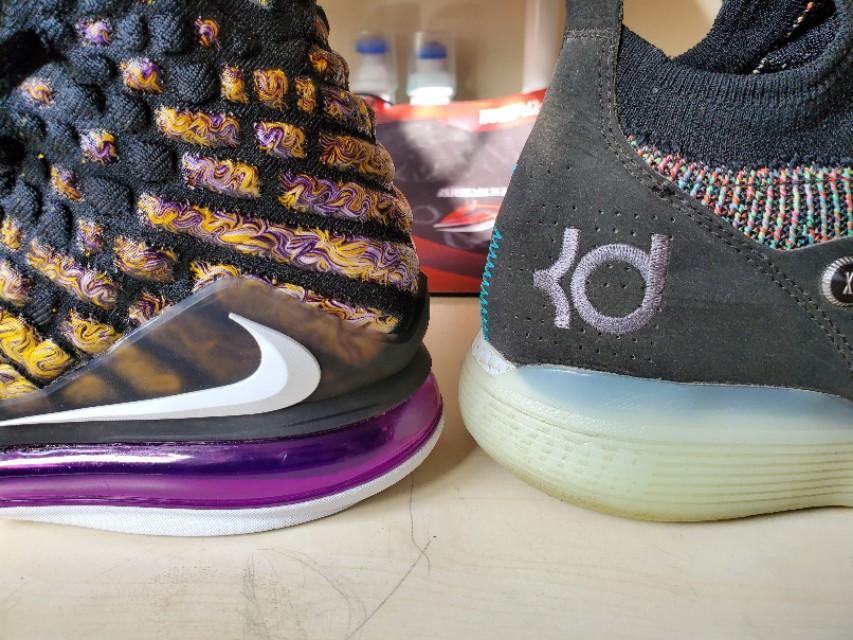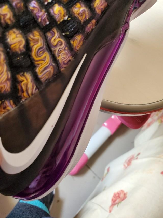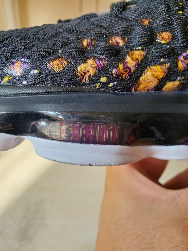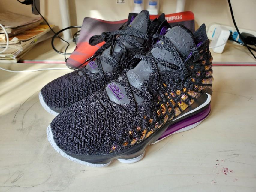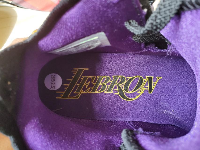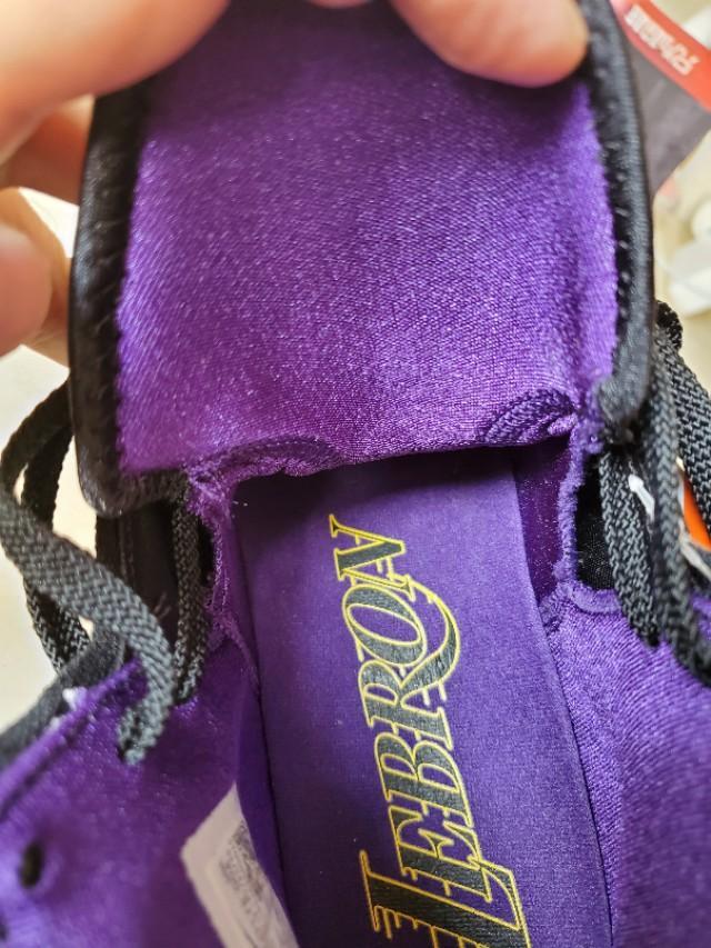 黑,紫,金构成的湖人配色还是一如既往的经典和美丽,不过个人感觉这一代老詹的鞋颜值真的不那么高,尤其是俯视角度,真的不好看,很像老头鞋。有点对不起这么好看的配色啊。