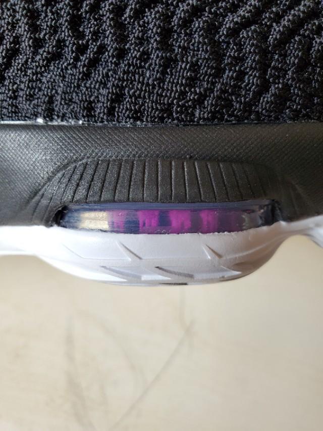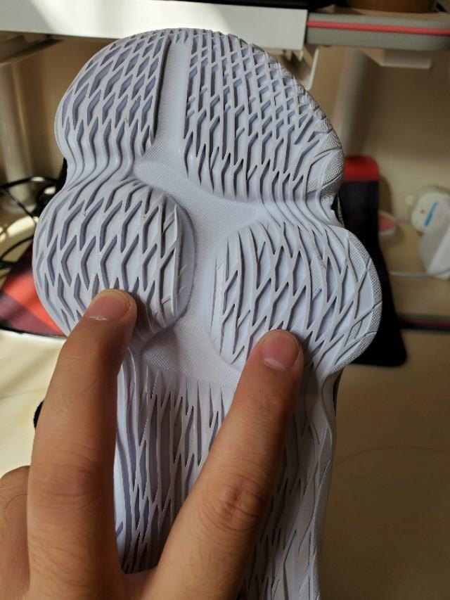 前掌zoom形态的改变大家都能理解,分体式的zoom在提升启动速度和局部支撑以及灵活性上的作用还是比较明显的,不过后掌缓震的应用实在让人摸不着头脑。很多质疑的声音,这是糊弄鬼呢,把跑鞋气垫拿来篮球鞋用,这不成了断腿鞋了。其实我也有这样的质疑和担心,篮球鞋重要的是稳定性,这样的气垫能不能提供稳定的性能?在试穿过程中后跟两侧气垫非常轻易的就会发生形变,让人感觉踩透了而且踩歪了。具体的实战表现还是要实战之后才能得到答案。