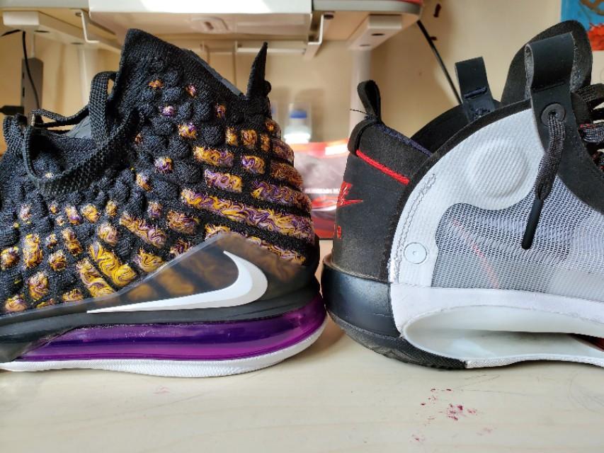 给大家对比一下后掌高度,老詹16代17代战靴的稳定性饱受质疑,被人们冠以崴脚神器。很多人说是因为中底厚,重心高,其实不然,大家可以对比。造成这种情况的根本还是气垫这种缓震科技的硬伤,缓震性能好但是支撑性差。尤其詹姆斯战靴使用的这种全掌全开放式的zoom气垫形式,天然的支撑性就会比内置气垫外围有缓震材料的组合缓震形式要差很多。这种缓震形式的脚感很爆炸,但是对穿着者脚踝力量的要求也很高。