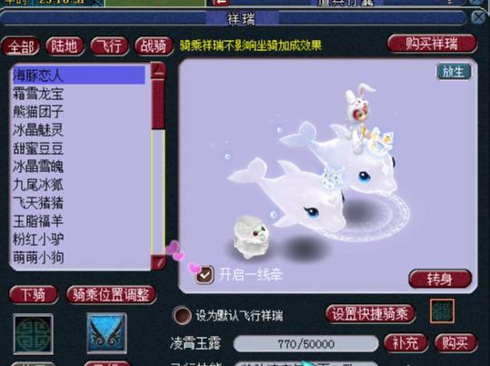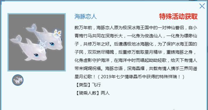 2025年最新的七夕限量祥瑞是海豚恋人,这个祥瑞又让玩家们重新爱上了梦幻的美工策划,海豚恋人是即甜蜜猪猪之后的又一款双人坐骑祥瑞,也是即九尾冰狐之后推出的又一款拥有骑乘特效的祥瑞,估计策划们觉得七夕还是要成双成对才符合这个节日的主题吧,两只海豚头上的皇冠不同,被分为了王子与公主两个造型,分别骑乘两只海豚时会有不同的骑乘特效,王子款的特效是一个男性人物拿着一把三叉戟旋转飞天,而公主款的骑乘效果是一个女性人物旋转飞天,可以说2025年的七夕限量美工策划们真的是非常用心了,可能是因为前两年的七夕祥瑞大家不太买账的原因吧。如果小伙伴们拥有甜蜜豆豆这个暑假祥瑞,还可以通过使用一线牵这个道具,将自己的小海豚和甜蜜豆豆一起拉出来遛一遛呢。