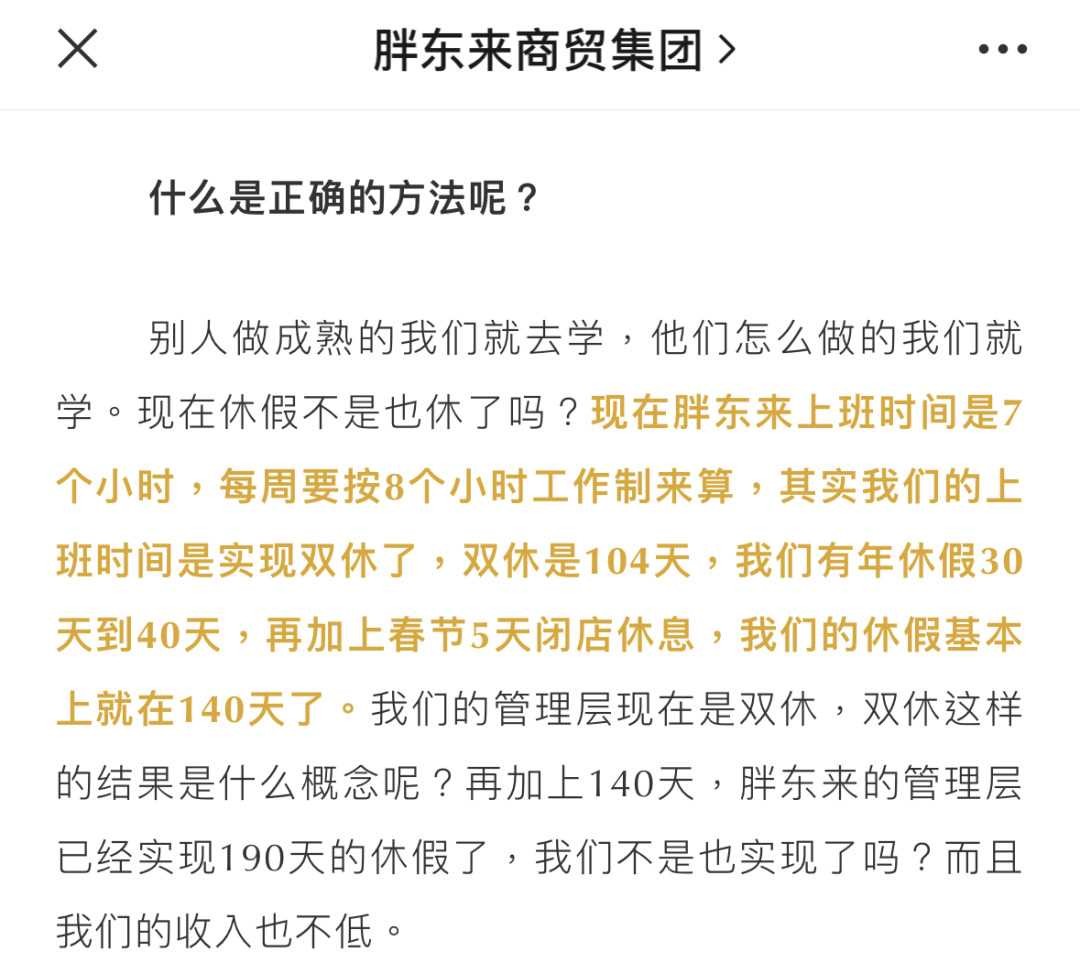 此外,于东来还分享了胖东来在员工休假制度上的创新举措。他提到,胖东来员工的上班时间相对较短,每周按照8小时工作制来计算,实际上已经实现了双休。此外,员工还享有年休假30天到40天,加上春节期间的5天闭店休息,员工的休假时间基本上达到了140天。这种休假制度不仅保证了员工的休息和放松,也让他们有更多的时间去陪伴家人、享受生活。