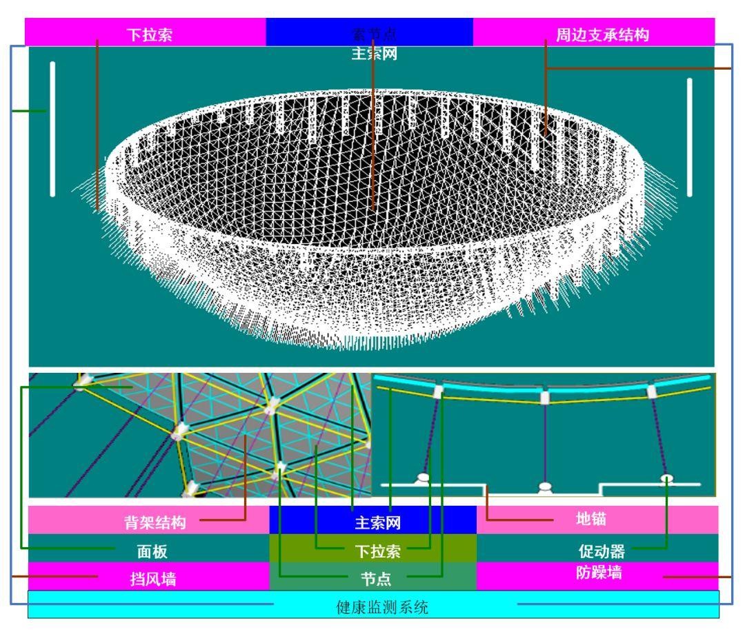 索网作为当下世界上跨度最大、精度最高的索网结构,也是世界上第一个采用变位工作方式的索网体系。