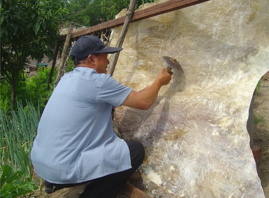 皮影的雕刻要经过 刮皮浆皮、拓样雕刻、着色涂油、拼钉装杆 几个步骤。 刀口和上色是最能体现雕刻艺人水平的地方。