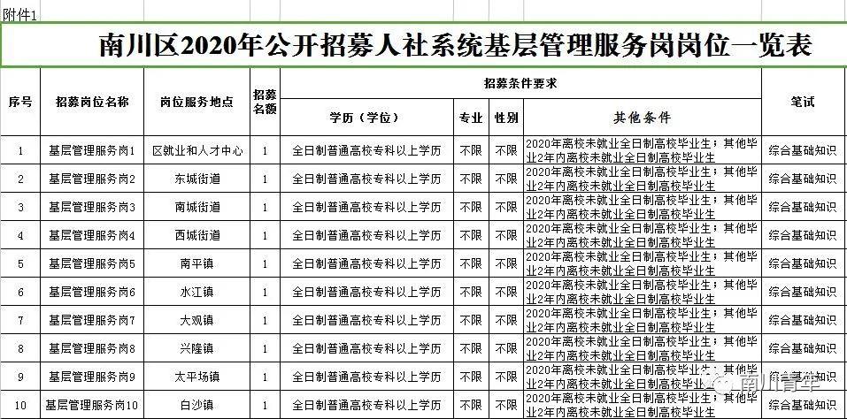 附件1:南川区2020年公开招募人社系统基层服务岗岗位一览表