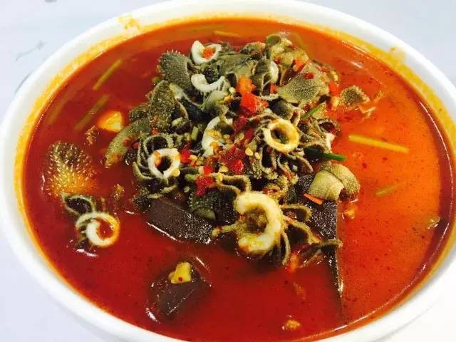 三合汤是用牛肉、牛肚、牛血加入辣椒、麻椒、葱花、香菜等调味品一起制作而成,集香、辣、麻、香于一体,是一道当地十分受欢迎的特色小吃。